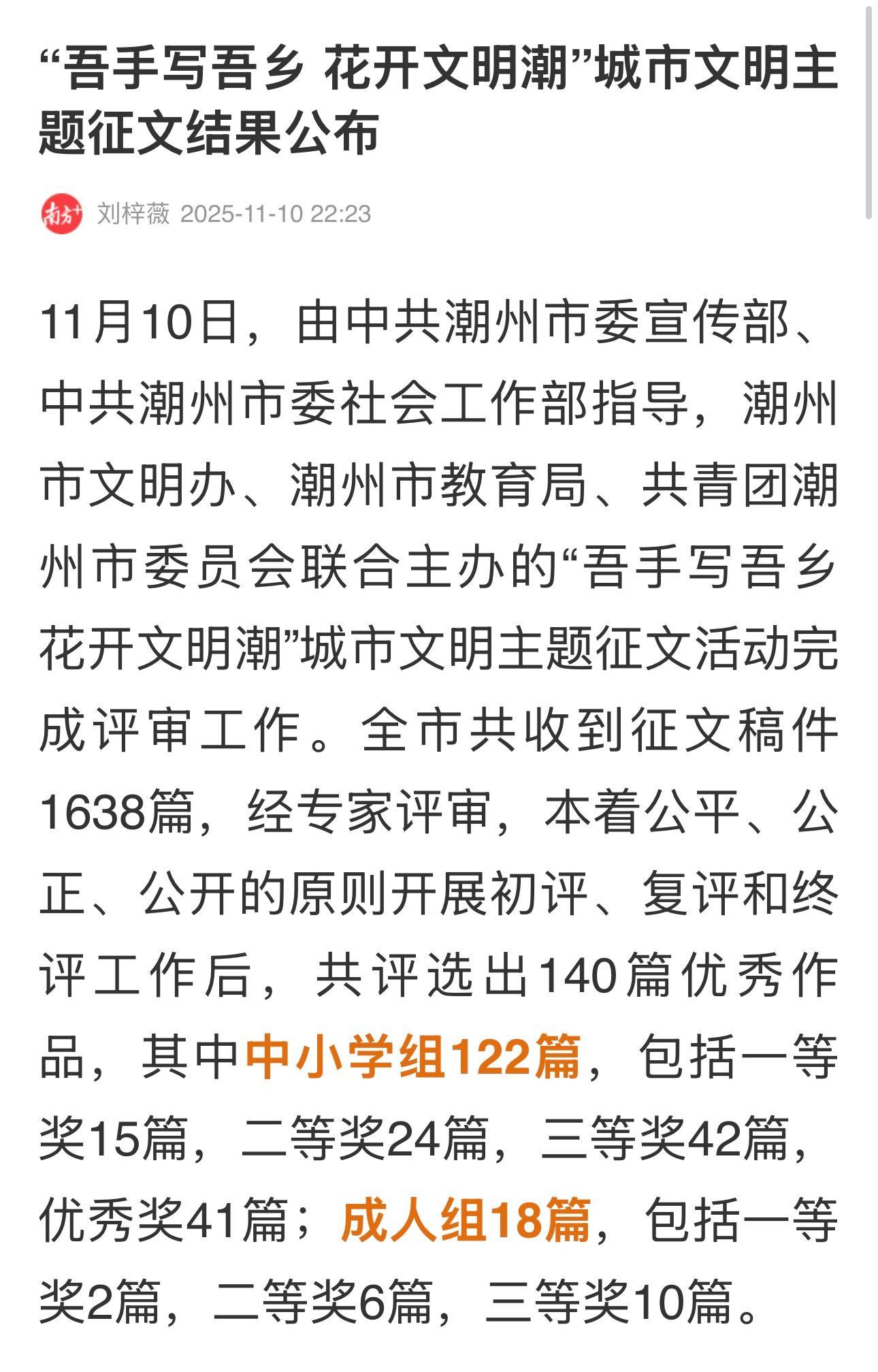 她们以真挚笔触书写家乡文明的图景,带领读者领略古城新风,传递向上向善的力量。祝贺获奖作者,愿湘桥文脉,在时代的热潮中愈发馥郁。